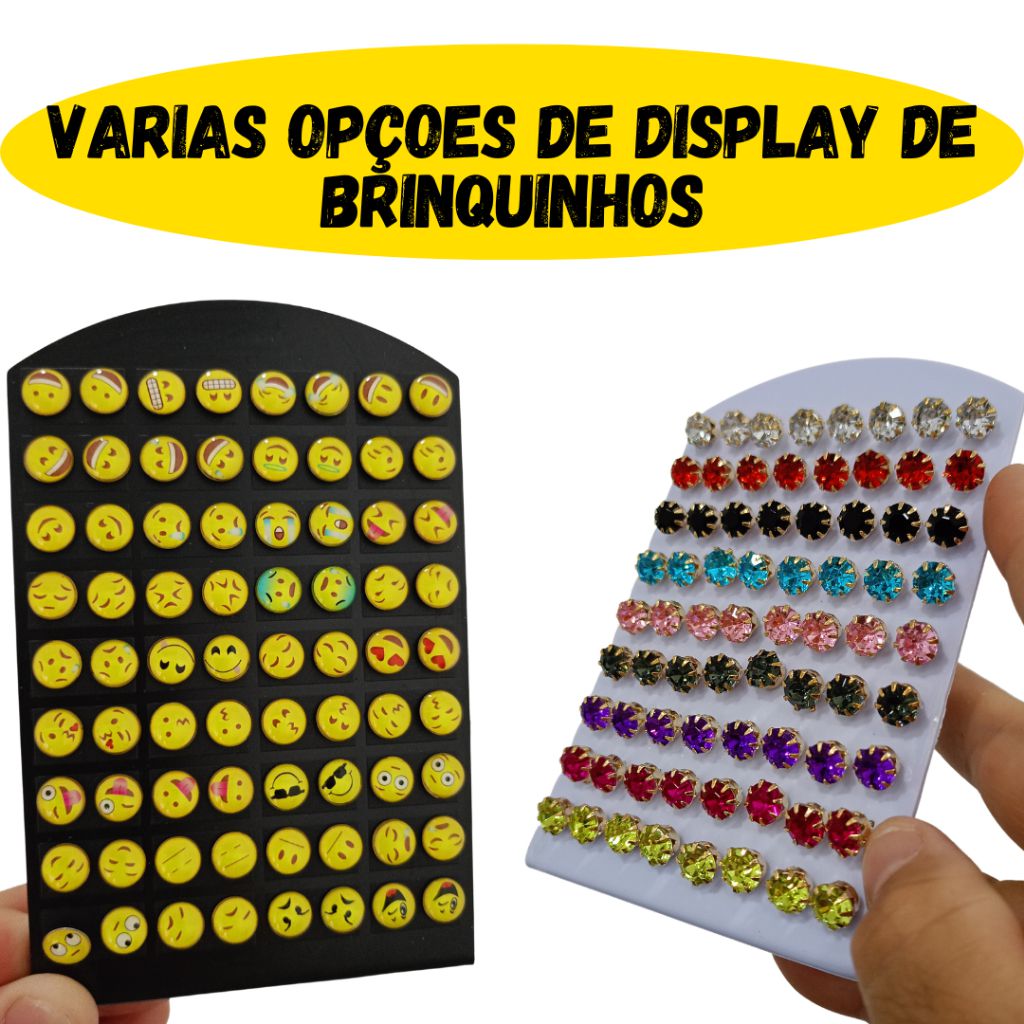 Display com 36 pares de brincos pequenos em tamanhos variados